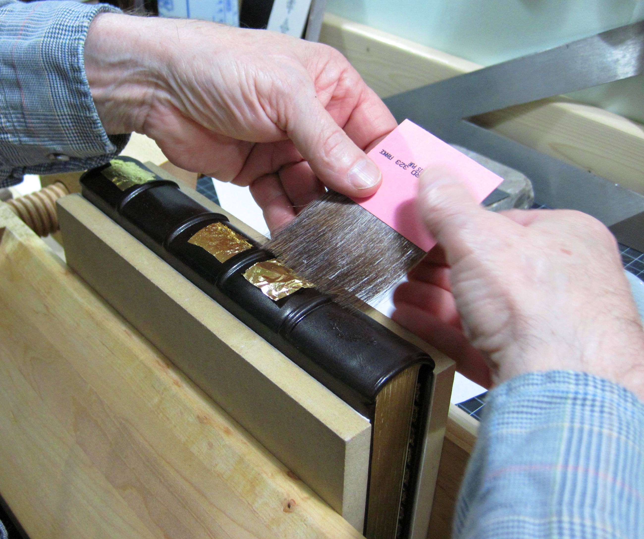 Applying gold leaf to the blind-tooled impressions Sep24 Published at 2600 × 2175 in Gold Tooling Tennyson’s The Princess ← Previous Next → The binder uses a gilder’s tip to transfer the pieces over the blind-tooled impressions.