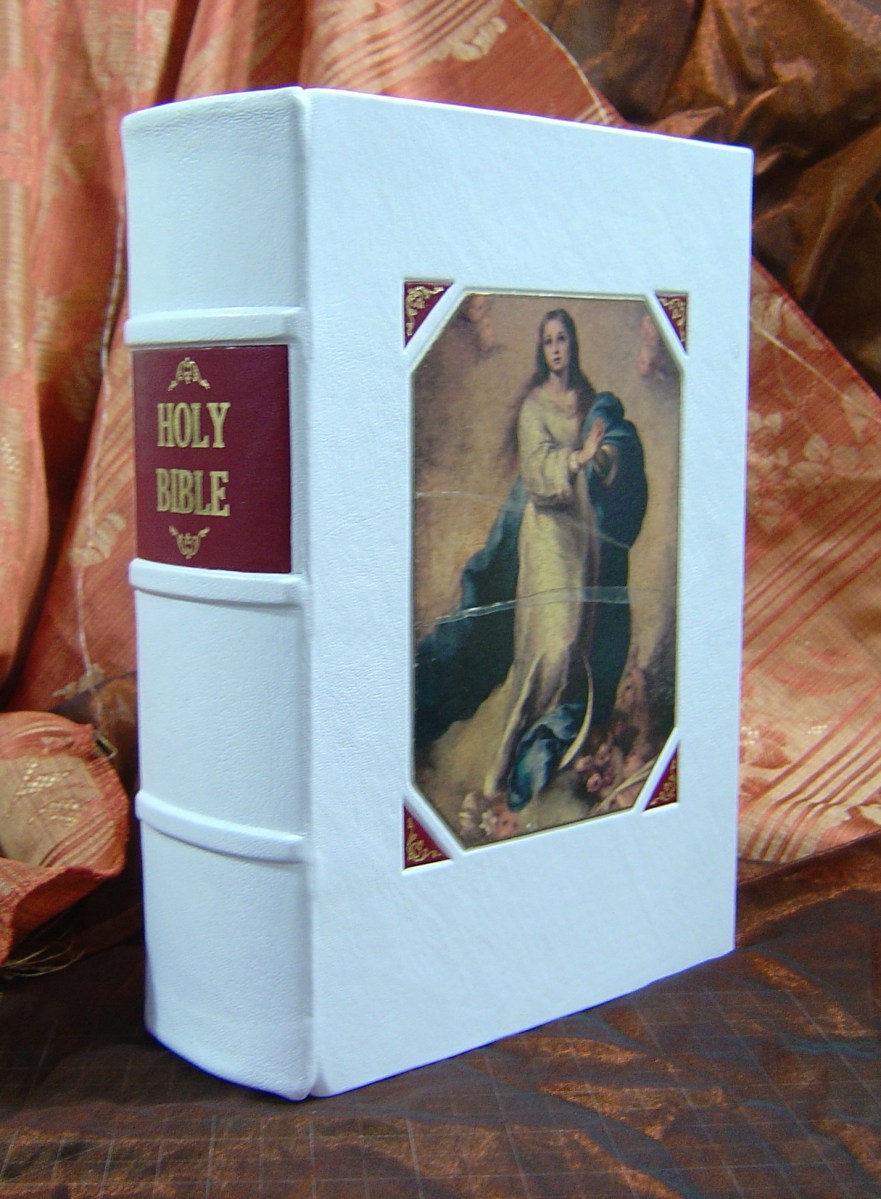 ??????????????????????????????? Apr21 Published at 1428 × 1944 in Bible Restorations 2012-2014 ← Previous Family Bible completely rebound in white goatskin. Original cover illustration as inset, gold tooled onlays